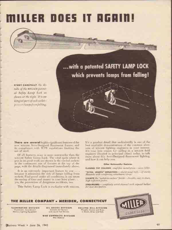Original World War 2 electrical industry trade magazine vintage ad for THE MILLER COMPANY of Meriden, CT. Miller Does It Again With a Patented Safety Lamp Lock Which Prevents Lamps from Falling. Aero-Designed fluorescent fixtures. Old 1943 WW2 era propaganda magazine advertisement.