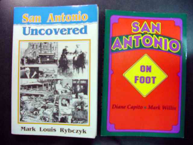 2 Soft covered books, first titled SAN ANTONIO ON FOOT by Diane Capito & Mark Willis, 1993, 178 pages. Whether you are a native San Antonian or visitor, this book is your guide to a walking tour of San Antonio. The 24 walks cover many of the segments that comprise San Antonio: historic downtown, the River Walk, the missions, Fort Sam Houston, residential neighborhoods, city parks, and local college campuses. In addition mall walks and fitness trails in the city are covered; and the second book is titled SAN ANTONIO UNCOVERED by Mark Rybczyk, 1992, 290 pages. ISBN 1556221452