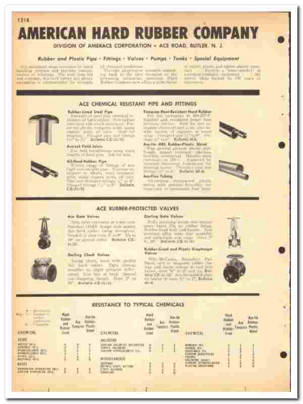 Products include Ace Chemical Resistant Pipe & Fittings, Ace Rubber-Protected Valves, Ace Acid Pumps, Rubber Lined Tanks & Equipment, Tempron & Hard Rubber Sheets for Fabricating, Utensils and Special Molded Parts, all are fully featured.