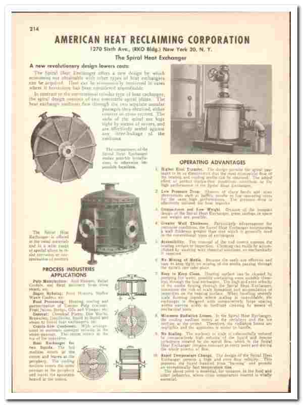 'The Spiral Heat Exchanger offers a new design by which economies not obtainable with other types of heat exchangers can be acquired. Heat can be economically recovered in cases where it heretofore has been considered unprofitable'.