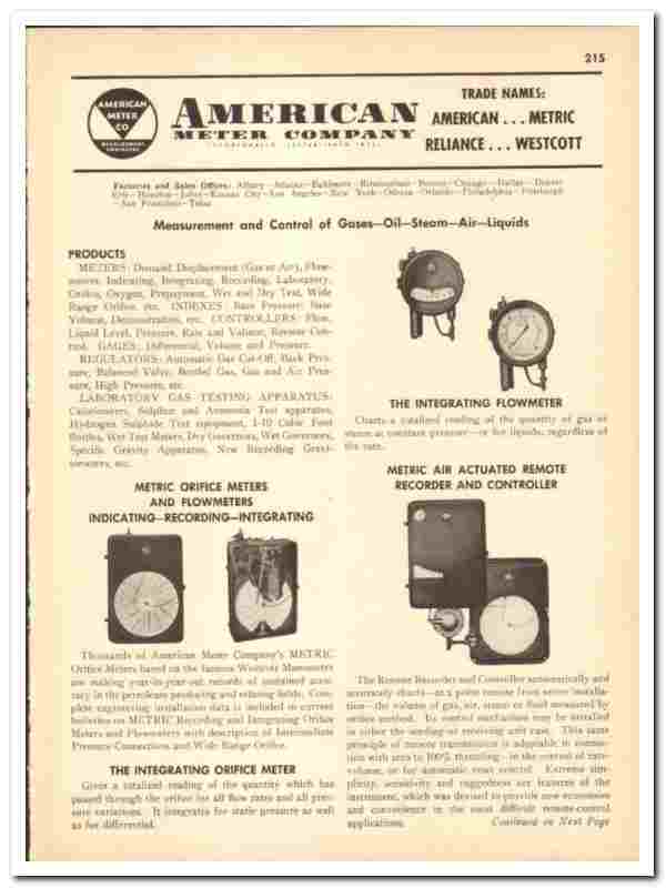 Original 1948 industrial trade vintage catalog for the AMERICAN METER COMPANY. Main office was located at 60 East 42nd Street, New York, NY. (Established 1836). Trade Names: American, Metric, Reliance & Westcott.