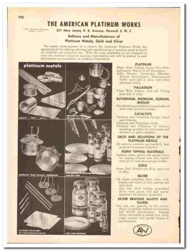 'For nearly three-quarters of a century, the American Platinum Works has specialized in the refining, alloying and manufacturing of precious metal products for scientific and industrial use. With this long experience we are prepared to meet the chemical industries exacting requirements'.