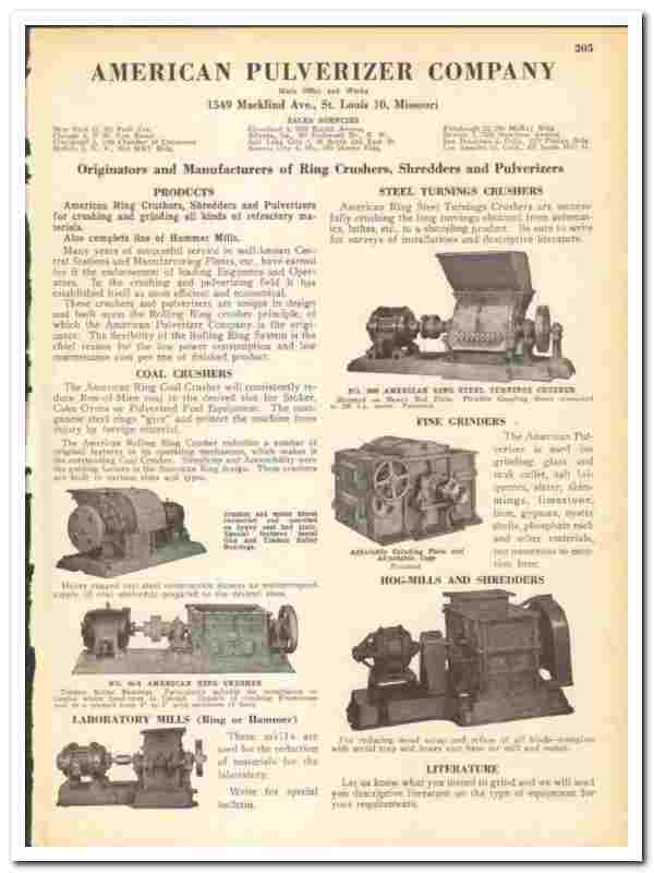 Original 1945 industrial trade vintage catalog for the AMERICAN PULVERIZER COMPANY. Main office and works were located at 1549 Macklind Avenue, St Louis, MO.