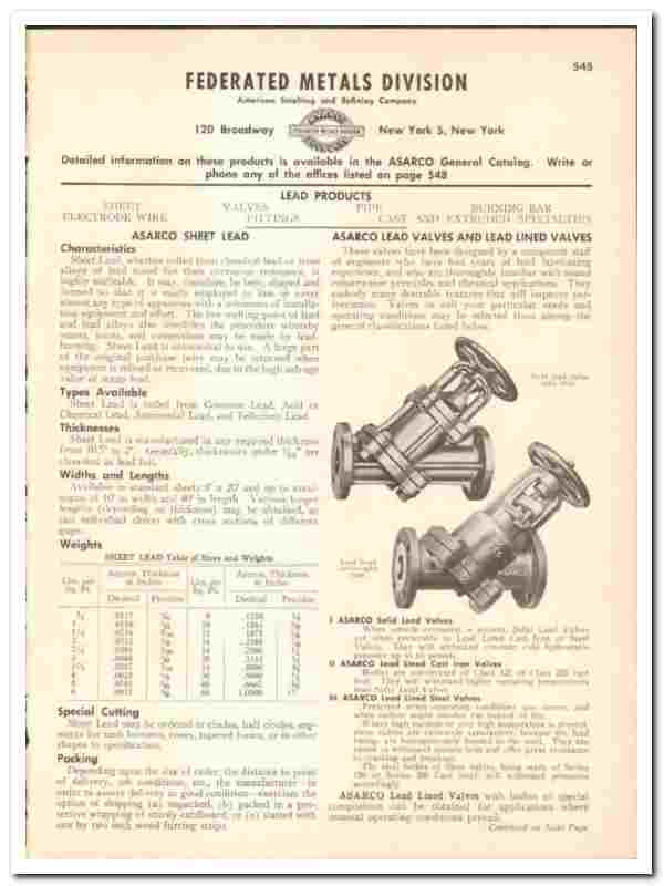 Products include ASARCO Sheet Lead, ASARCO Lead Valves & Lead Lined Valves, ASARCO Lead Pipe, Burning Bar & Electrod Wire, ASARCO Lead Fittings, ASARCO Cast and Extruded Lead Specialties, all are fully featured.
