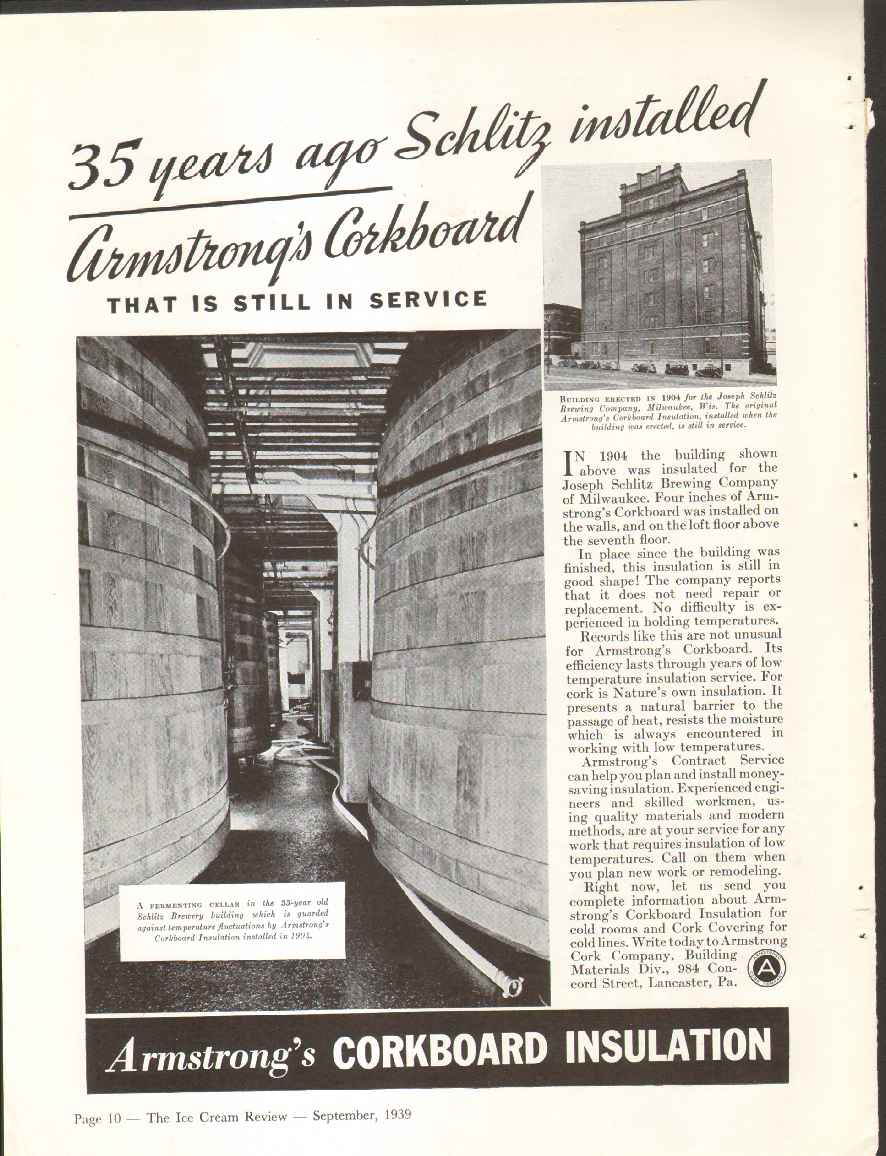 Manufacturers of Armstrong's Corkboard Insulation. '35 Years Ago, Schlitz Installed Armstrong Corkboard That is Still in Service'.