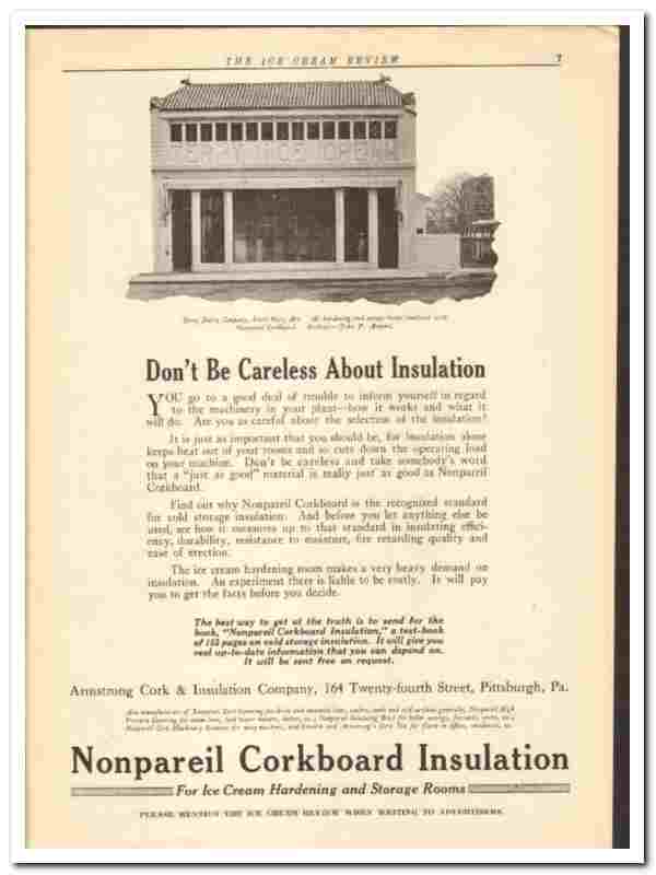 Manufacturers of Nonpareil Corkboard Insulation for the Dairy and Ice Cream Industries. 'Dont Be Careless About Insulation'.