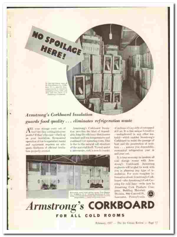 Original 1937 ice cream vintage magazine ad for the ARMSTRONG CORK PRODUCTS COMPANY. Main office and plant were located at 984 Concord Street, Lancaster, PA.