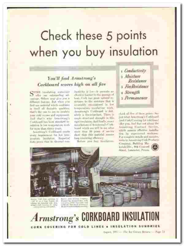 Manufacturers of Armstrong's Corkboard Insulation. 'Cork Covering for Cold Lines & Insulation Sundries'.