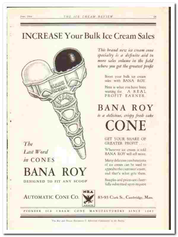 Automatic Cone Company 1934 vintage ice cream ad Bana Roy bulk sales