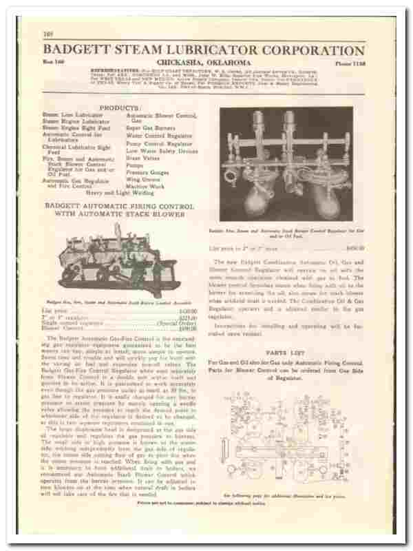 Products include Automatic Firing Control with Automatic Stack Blower, Gas Burners, Steamline Lubricators, Steam Lubricators for Engines or Pumps, Automatic Cut-Off for Lubricators and Hammer Unions, all are fully featured.