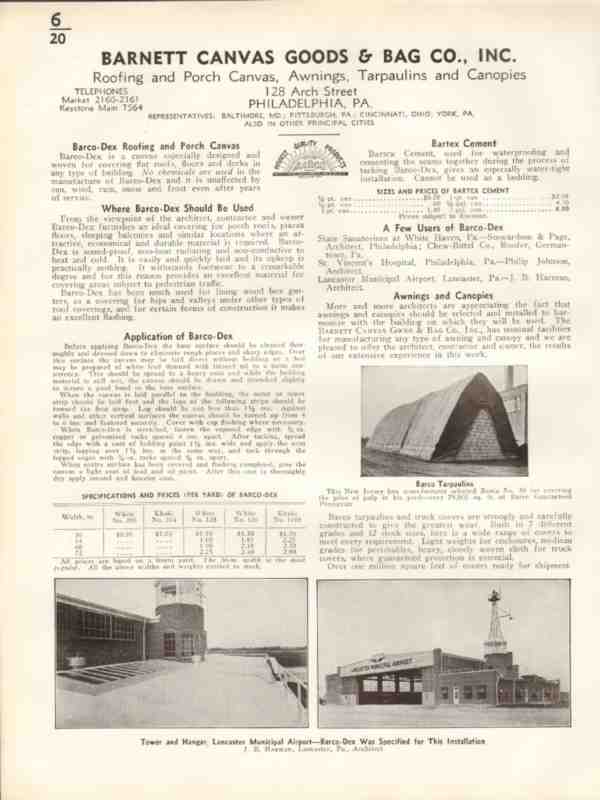 Original roofing trade vintage catalog for BARNETT CANVAS GOODS & BAG COMPANY, INC. was located at 128 Arch Street, Philadelphia, PA. Manufacturers of Roofing, Awnings, Tarpaulins and Canopies. Bartex Cement, Barco Tarpaulins. Tower & Hangar, Lancaster Municipal Airport, J.B. Harman, Architect. Unbound from a large 1938 architectural catalog, this unique old one page technical brochure would display beautifully matted and framed. A fantastic addition to your retro roofing construction library.