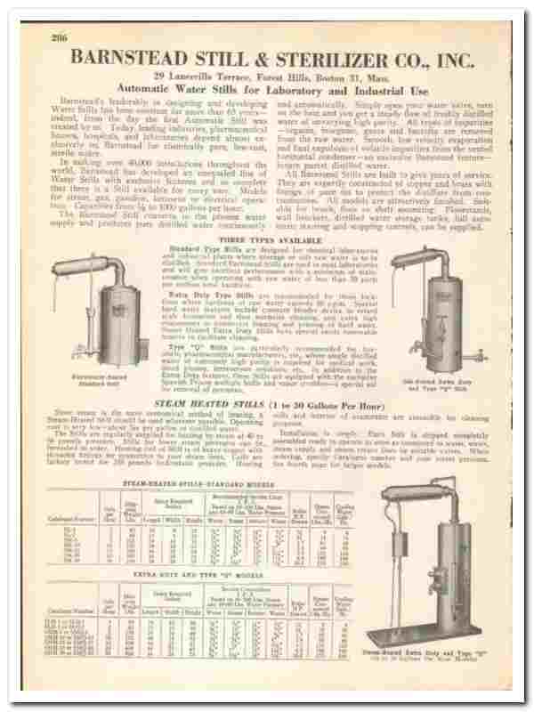 Original 1945 industrial trade vintage catalog for the BARNSTEAD STILL & STERILIZER COMPANY. Main office and plant were located at 29 Lanesville Terrace, Forest Hills, Boston, MA. (Since 1880).