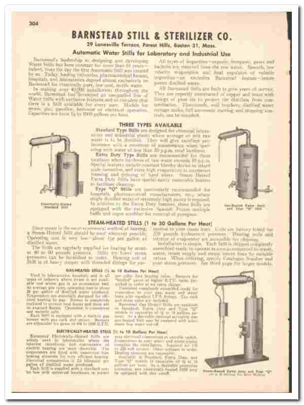 Original 1948 industrial trade vintage catalog for the BARNSTEAD STILL & STERILIZER COMPANY. Main office and plant were located at 29 Lanesville Terrace, Forest Hills, Boston, MA. (Since 1883).