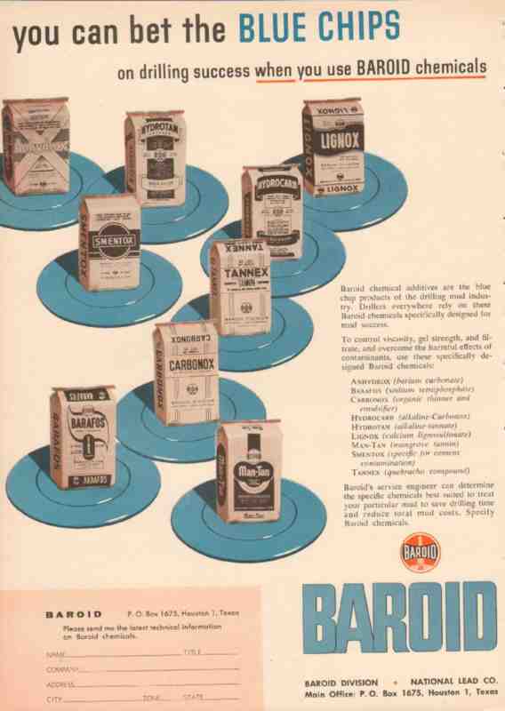 Original oil and gas trade magazine vintage ad for NATIONAL LEAD COMPANY of Houston, TX. Baroid Division. You can bet the Blue Chips on drilling success when you use Baroid chemicals. To control viscosity, gel strength, and filtrate use Anhydrox, Barafox, Carbonox, Hydrocarb, Hydrotan, Lignox, Smentox and Tannex. This unique 1955 old oilfield magazine advertisement would display beautifully matted and framed.