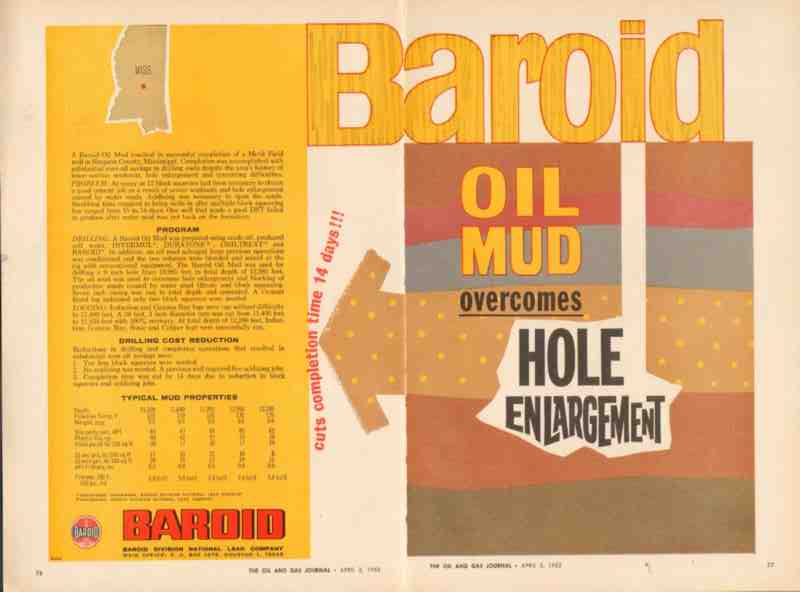 Original oil and gas trade magazine vintage ad for NATIONAL LEAD COMPANY of Houston, TX. Baroid Division. Baroid Oil Mud Overcomes Hole Enlargement. Successful completion of a Merit Field well in Simpson County, Mississippi. Invermul, Duratone, Driltreat. This unique 1962 old oilfield petroleum drilling industry magazine advertisement would display beautifully matted and framed. Two-page gatefold advertisement.