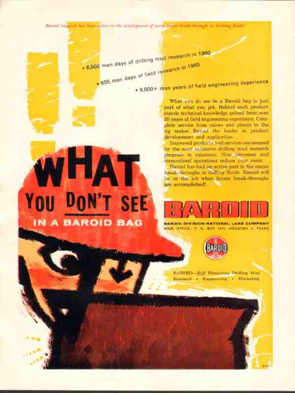 Original oil and gas trade magazine vintage ad for NATIONAL LEAD COMPANY of Houston, TX.  Baroid Division.  What You Don't See in a Baroid Bag.  80001 Man Days of Drilling Mud Research in 1960. This unique 1962 old oilfield petroleum industry magazine advertisement would display beautifully matted and framed.