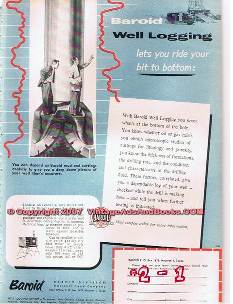 Original oil and gas trade magazine vintage ad for NATIONAL LEAD COMPANY of Houston, TX. Baroid Division. Baroid Well Logging lets you ride your bit to bottom. You can depend on Baroid mud and cuttings analysis to give you a deep down picture of your well that's accurate. Baroid Automatic gas detectors. Unique 1955 old oilfield petroleum drilling industry magazine advertisement. Approximate size 9 x 12 inches.