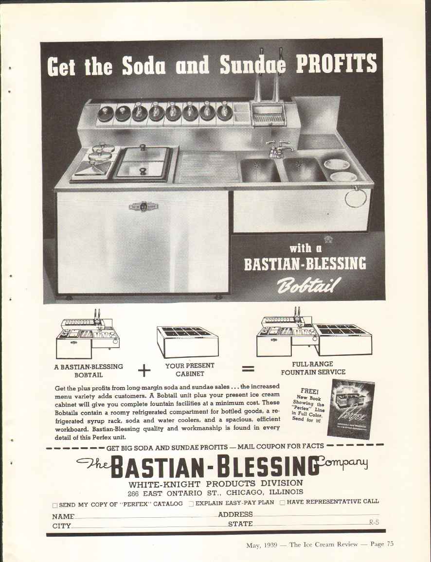 Manufacturers of Ice Cream and Soda Fountain Equipment. 'Get the Soda and Sundae Profits with Batian-Blessing Bobtail'.