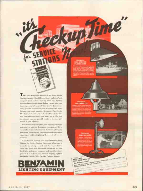 Original old service station trade magazine vintage ad for BENJAMIN ELECTRIC MANUFACTURING COMPANY of Des Plaines, IL. Check-Up Time for Stations. What Every Operator Should Know About Lighting Equipment. Due-Service Floodlight, Column-Lite, Service-Lite. This unique 1937 gasoline industry advertisement would display beautifully matted and framed.