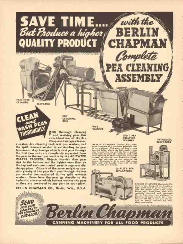 Original vintage food packing trade magazine ad for BERLIN CHAPMAN COMPANY. Main office and factory was located in Berlin, WI. Save Time But Produce a Higher Quality Product with the Berlin Chapman Complete Pea Cleaning Assembly. Fan type cleaner, elevator, dry cleaning reel, wet washer, split pea remover washer, hydraulic elevators, quality pea separators. Canning Machinery For All Food Products. Old 1946 food processing advertisement.