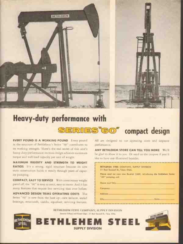 Original oil and gas trade magazine vintage ad for BETHLEHEM STEEL COMPANY Supply Division of Tulsa, OK. Heavy Duty Performance with Series 60 Pumping Unit's Compact Design. This unique 1962 old oilfield petroleum pumping equipment magazine advertisement would display beautifully matted and framed.