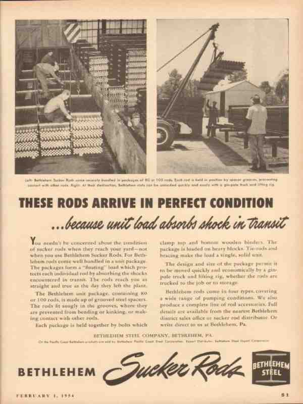 Original vintage oil and gas trade magazine ad for BETHLEHEM STEEL COMPANY of Bethlehem, PA. These Rods Arrive in Perfect Condition Because Unit Load Absorbs Shock in Transit. Bethlehem Sucker Rods. Old 1954 petroleum industry oilfield and refinery advertisement