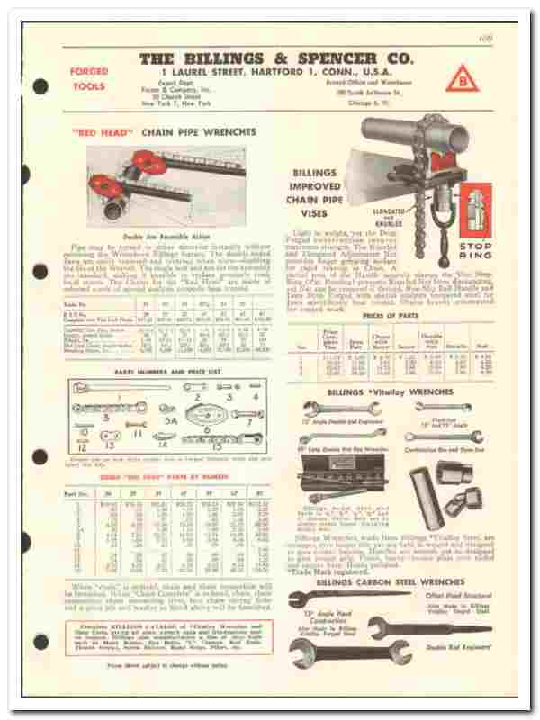 Products include 'Red Head' Chain Pipe Wrenches, Chain Pipe Vises, Vitalloy Wrenches, and Billings Carbon Steel Wrenches, all are fully featured.