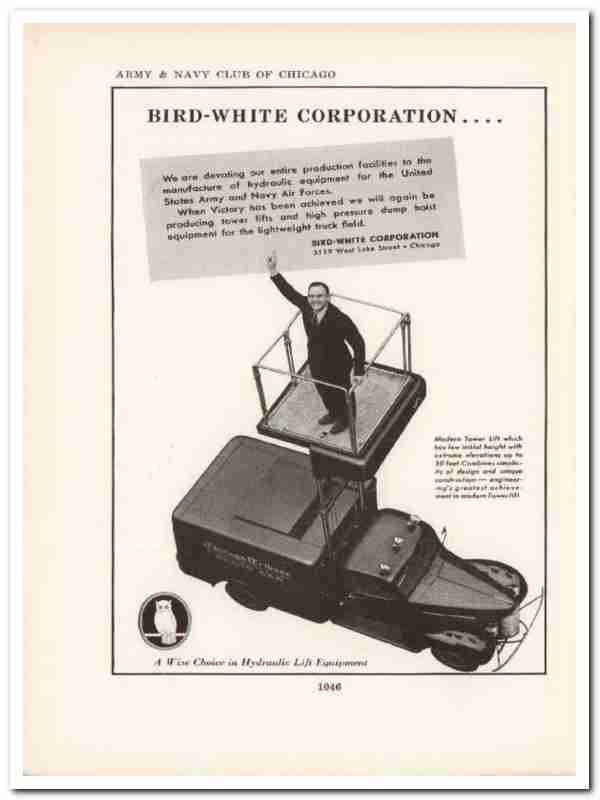 Original wartime industrial vintage ad for BIRD-WHITE CORPORATION. Main office and factory was located at 3119 West Lake Street, Chicago, IL. Hydraulic Equipment produced during WW2 for the United States Army and Navy Air Forces. When Victory has been achieved we will again be producing tower lifts and high pressure dump hoist equipment for the lightweight truck field. Shown is a Chicago Tribune Photo Car with Modern Tower Lift. This old 1943 one page industrial pottery trade magazine advertisement would display beautifully matted and framed.