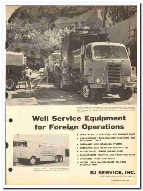 Products include Model 102-T Truck-Mounted Cementing, Pumping & Acidizing Unit, Model 111-T High-Pressure Cementing, Pumping & Acidizing Unit, Model 114-T High-Pressure Cementing, Fracturing & Acidizing Unit, Model 700-ST Bulk Cement Semi-Trailer, Model 400-S Skid-Mounted Cement-Mixing Unit, Skid-Mounted Pumping & Cementing Units, Pneumatic Bulk Handling Systems, BJ Service Cement Heads, Rubber Cement Plugs and Wooden Cement Plugs, all are featured.