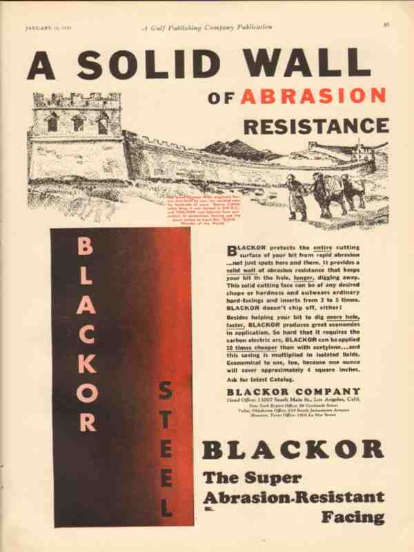 Original oil and gas trade magazine vintage ad for BLACKOR COMPANY of Los Angeles, CA. A Solid Wall of Abrasion Resistance. Blackor Steel, the super abrasion-resistant facing. This unique 1931 old oilfield petroleum equipment magazine advertisement would display beautifully matted and framed. Nice graphics.