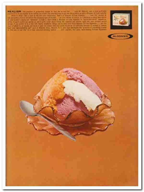 Original ice cream trade magazine vintage ad for BLOOMER BROTHERS COMPANY. Main office and plant was located in Newark, NY. Realism, presenting scenes as in real life. Hi-Tone Vignette, realistic, full color and taste-teasing full color illustration for your containers. This unique 1960 old dairy industry magazine advertisement would display wonderful matted and framed. Nice graphics.