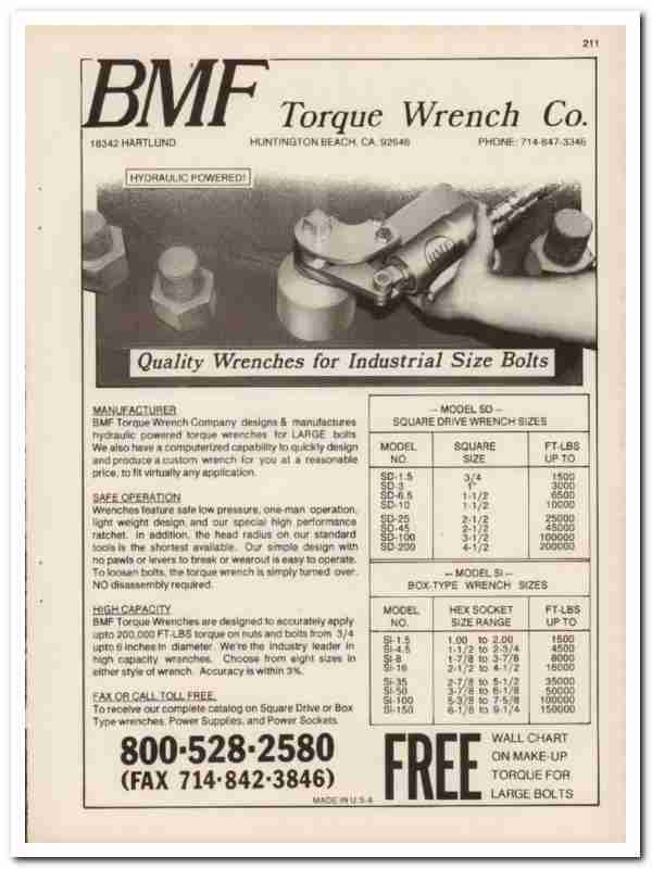 Original 1994 industrial trade vintage catalog for the BMF TORQUE WRENCH COMPANY. Main office and plant was located at 18342 Hartlund Street, Huntington Beach, California.