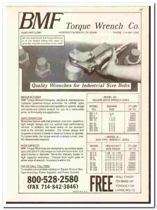Original 1998 Oil and Gas trade vintage catalog for the BMF TORQUE WRENCH COMPANY. Main office was located at 18342 Hartlund Lane, Huntington Beach, CA.