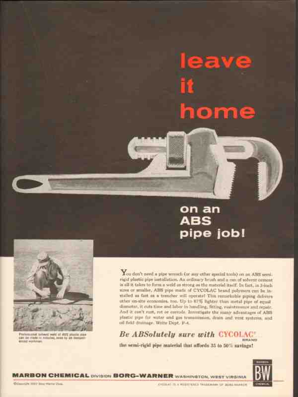 Original old petroleum trade magazine ad for BORG-WARNER COMPANY of Washington, WV. Leave It Home on an ABS Pipe Job! You don't need a pipe wrench on a ABS semi-rigid plastic pipe installation. Cycolac pipe can't rust, rot or corrode. For water and gas transmission and oil field drainage. Marbon Chemical Division. This 1962 oil and gas magazine advertisement would display beautifully matted and framed.