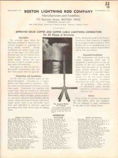 Original electrical trade vintage catalog for BOSTON LIGHTNING ROD COMPANY. Main office and factory was located at 755 Boylston Street, Boston, MA. Manufacturers and Installers of Approved Solid Copper and Copper Cable Lightning Conductors for All Classes of Structures. Used at Estates of G.W. Perkins, Riverdale, NY., Ernest Dane, Brookline, MA., W.S. Barstow, Great Neck, LI., Ogden Reid, Purchase, NY. and Miss Anne Morgan, Mt. Kisco, NY. Also installed at Riverside Church, New York City, NY, St. Bartholomew's Church, Old South Church, Boston, MA, Heinz Memorial Chapel, Harvard University, Yale University, Fordham College, Princeton University, Colgate-Rochester Divinity School and more. Disbound from a large 1938 architect construction materials book, this unique old one page technical specifications brochure would display wonderfully matted and framed. A marvelous addition to your retro electrical equipment library.