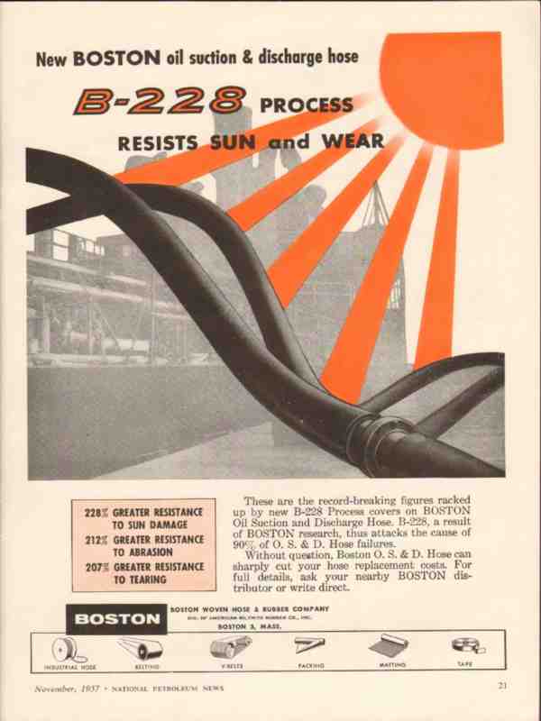 Original oil and gas trade vintage ad for the BOSTON WOVEN HOSE. & RUBBER COMPANY of Boston, MA. Oil Suction and Discharge Hose B-228 Process Resists Sun and Water. This unique 1957 old petroleum oilfield and refinery equipment magazine advertisement would display beautifully matted and framed