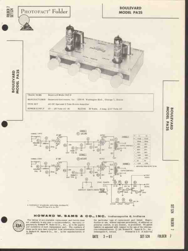 Vintage BOULEVARD model PA25 2 tube stereo audio amplifier. AC/DC. Original old Sams Photofact manual includes schematics, layouts, voltage & resistance readings, parts list. 2 pages. Dated 1961.