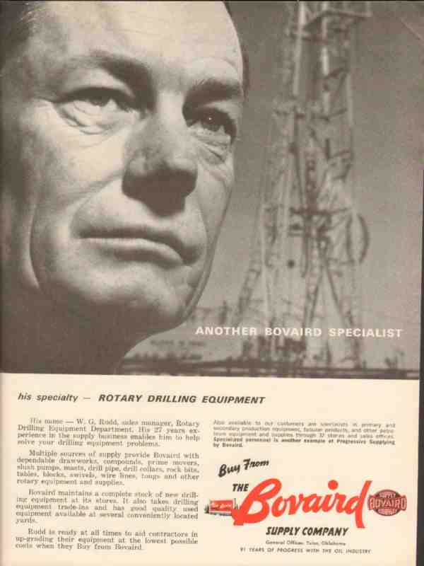 Original oil and gas trade magazine vintage ad for THE BOVAIRD SUPPLY COMPANY of Tulsa, OK. Shown in the photograph is Mr. W.G. Rudd, Sales Manager, Rotary Drilling Equipment Department. Another Bovaird Specialist. His 27 years experience in the supply business enables him to help solve your drilling equipment problems. This unique 1962 old oilfield petroleum drilling tools and equipment magazine advertisement would display beautifully matted and framed.