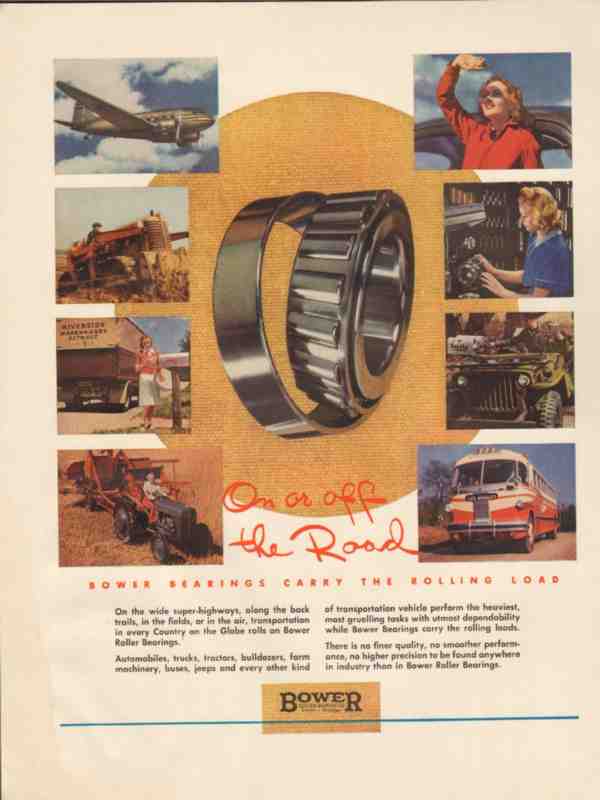 Original old transportation industry trade magazine ad for BOWER ROLLER BEARING COMPANY of Detroit, MI. On or Off the Road Bower Bearings Carry the Rolling Load. Cars, trucks, tractors, bulldozers, farm machinery, buses, jeeps. This 1947 magazine advertisement would display beautifully matted and framed.