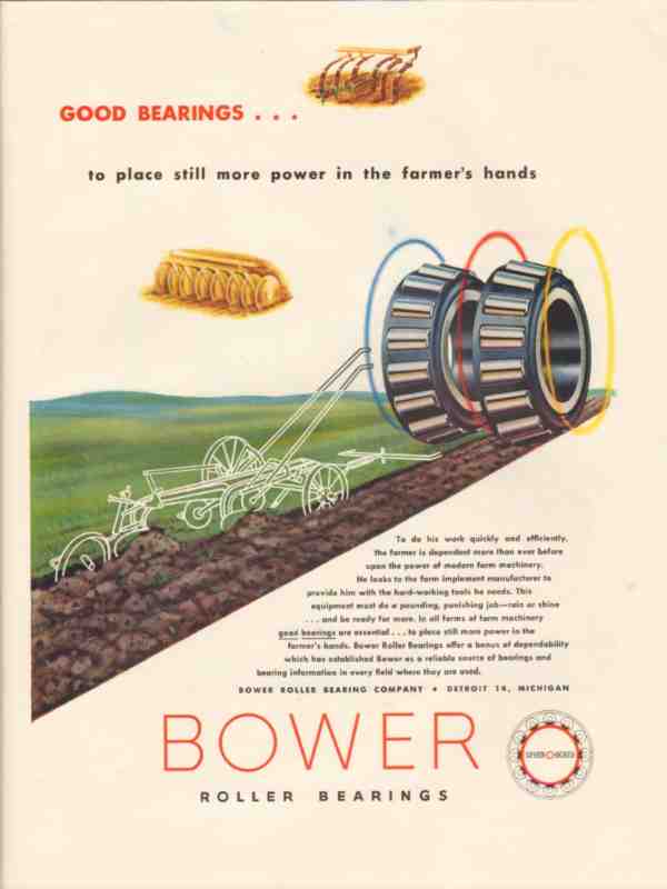 Original old farm machinery industry trade magazine vintage ad for BOWER ROLLER BEARING COMPANY of Detroit, MI. Good Bearings to Place Still More Power in the Farmer's Hands. The farmer is dependent more than ever before upon the power of modern farm machinery. This 1947 magazine advertisement would display beautifully matted and framed.