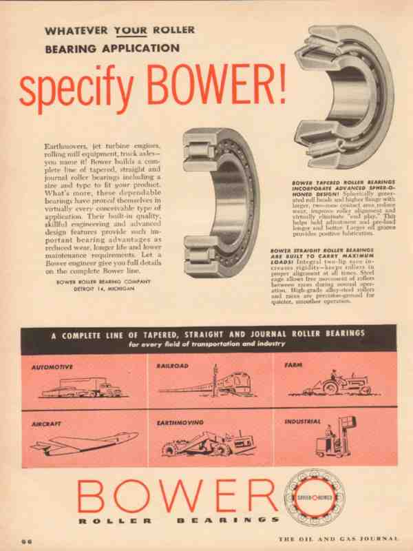Original oil and gas trade magazine vintage ad for BOWER ROLLER BEARING COMPANY of Detroit, MI. Specify Tapered, Straight and Journal Bearings. This unique 1955 oil and gas equipment advertisement would display beautifully matted and framed.