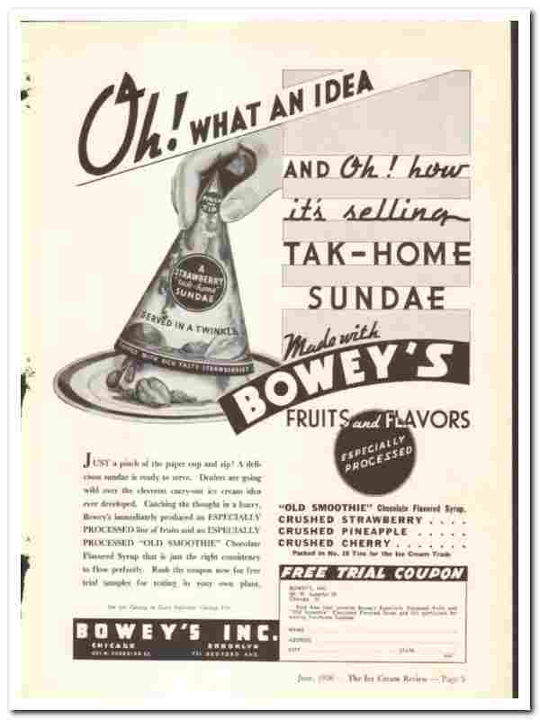 Boweys Inc 1936 vintage ice cream ad fruits flavors Tak-Home Sundae
