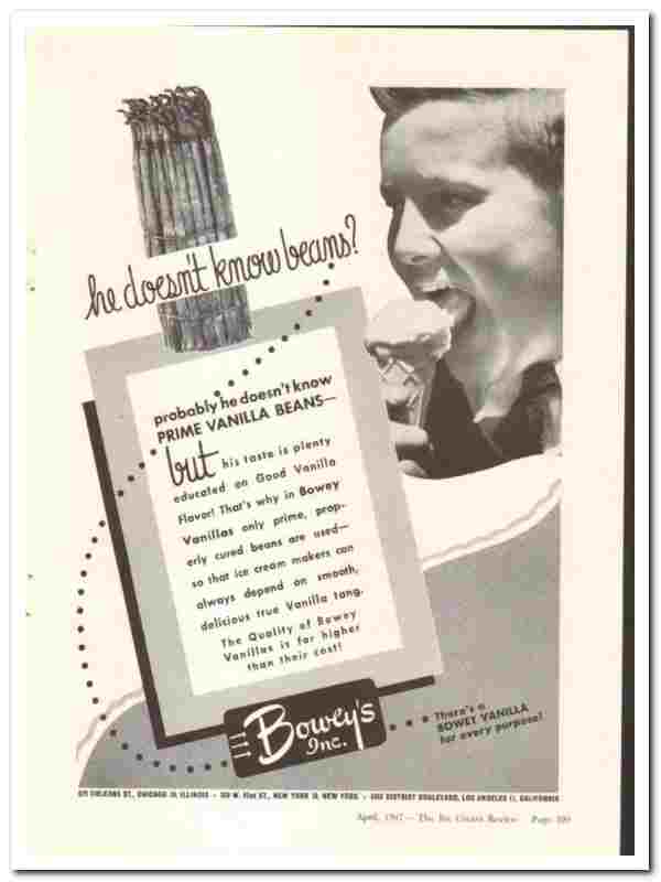 Boweys Inc 1947 vintage ice cream ad Prime Vanilla Beans flavor