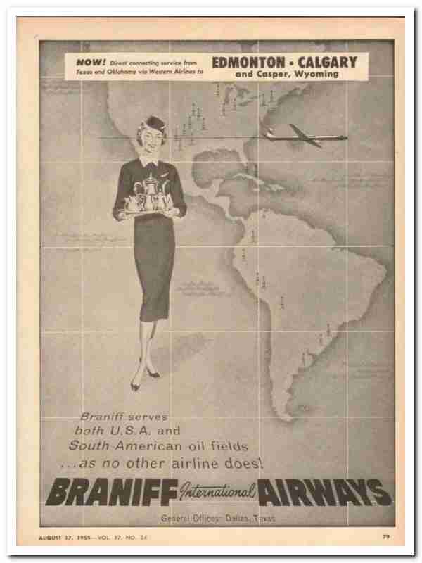 Original oil and gas vintage magazine ad for BRANIFF INTERNATIONAL AIRWAYS. Edmonton Calgary and Casper, WY direct connecting service from Texas and Oklahoma via Western Airlines. Serving USA and South American oilfields as no other airline does. General offices were located in Dallas, TX.