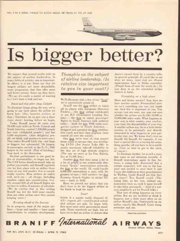Original old airline and aircraft trade magazine ad for BRANIFF INTERNATIONAL AIRWAYS of Dallas, TX. Is Bigger Better? Thoughts on the subject of airline leadership. This 1962 jet airplane magazine advertisement would display beautifully matted and framed.