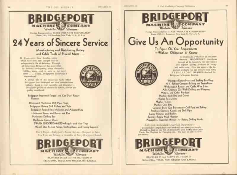 Original oil and gas trade magazine vintage ad for THE BRIDGEPORT MACHINE COMPANY of Wichita, KS. 24 Years of Sincere Service. Give US An Opportunity to Figure On Your Requirements. This unique 1931 old oilfield petroleum drilling tools and equipment magazine advertisement would display beautifully matted and framed. Two-page gatefold advertisement.