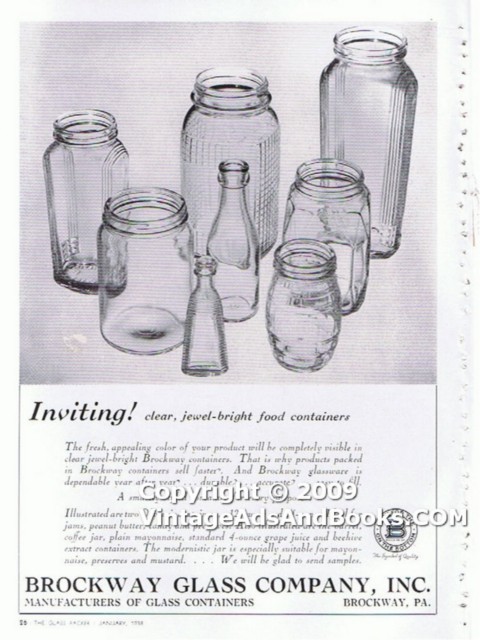 Original vintage magazine ad, BROCKWAY GLASS COMPANY, INC., of Brockway, PA. Inviting! Clear, Jewel-bright Food Containers. Illustrated are two Olympic containers, a 12-ounce and 24-ounce. Ideal for jams, peanut butter, candy and preserves. Also illustrated are the barrel, coffee jar, plain mayonnaise, stardard 4-ounce grape juice and beehive extract containers. Manufacturers of Glass Containers. Brockway Glass Company bought out the Tygart Glass Company in 1959. Old 1938 glass packer industry advertisement. Would look fantastic matted and framed.