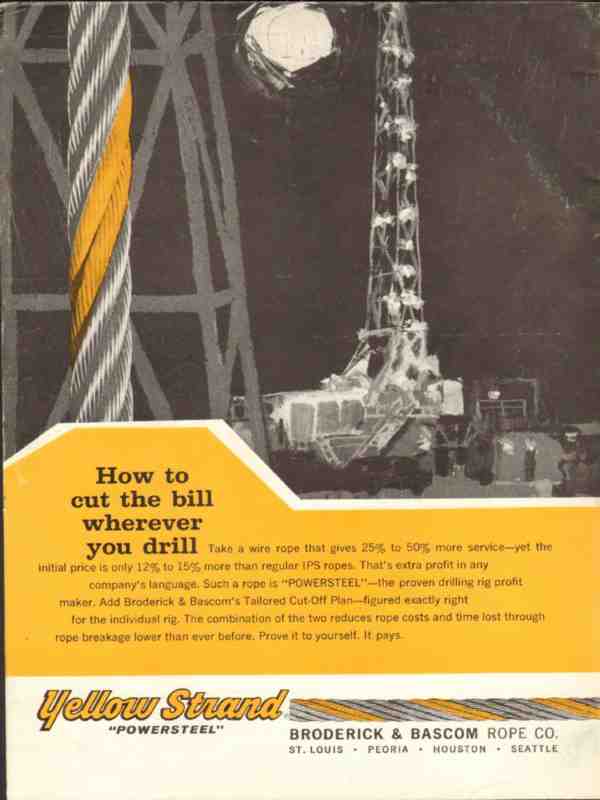 Original oil and gas trade magazine vintage ad for BRODERICK & BASCOM ROPE COMPANY of St. Louis, MO. How to Cut the Bill Wherever You Drill. Yellow Strand Powersteel Rope. This unique 1962 old oilfield petroleum drilling industry magazine advertisement would display beautifully matted and framed.