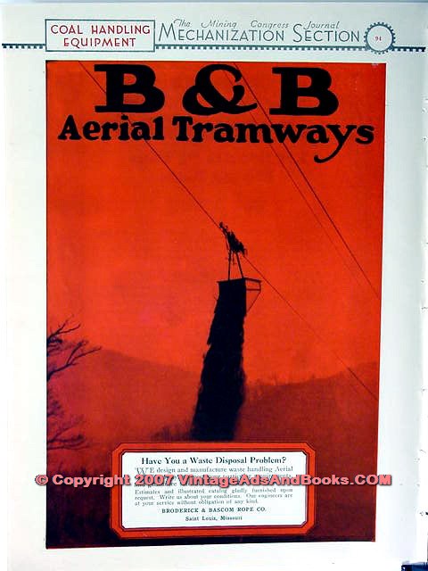 Original vintage magazine ad, BRODERICK AND BASCOM ROPE COMPANY., of Saint Louis, MO. B & B Aerial Tramways. Waste Disposal. Old 1928 mining equipment advertisement. Would look sensational matted and framed!