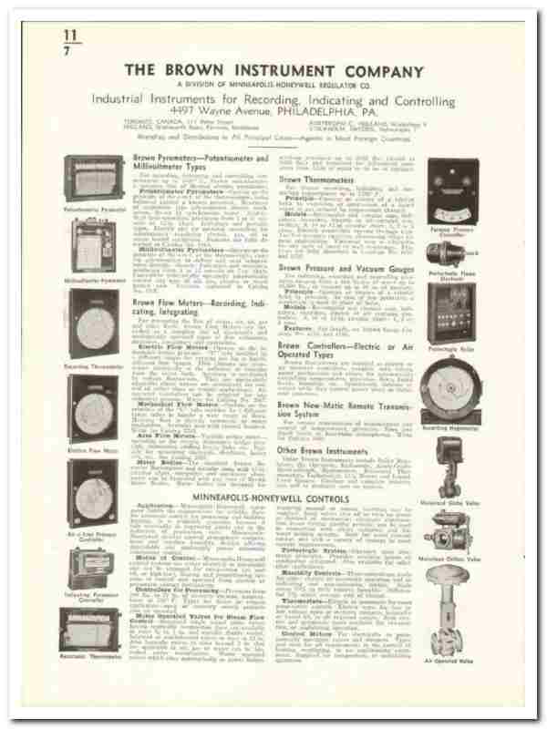 Products include Brown Pyrometers - Potentiometer & Millivoltmeter Types, Brown Flow Meters - Recording, Indicating & Integrating, Brown Thermometers, Brown Pressure & Vacuum Gauges, Brown Controllers - Electric or Air Operated Types, Brown New-Matic Remote Transmission System and Minneapolis-Honeywell Controls, all are fully featured.